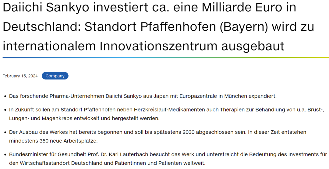 2024年2月15日,第一三共宣布将投资10亿欧元(合10.7亿美元)扩建位于德国慕尼黑的ADC生产设施,以满足未来潜在的增长需求。