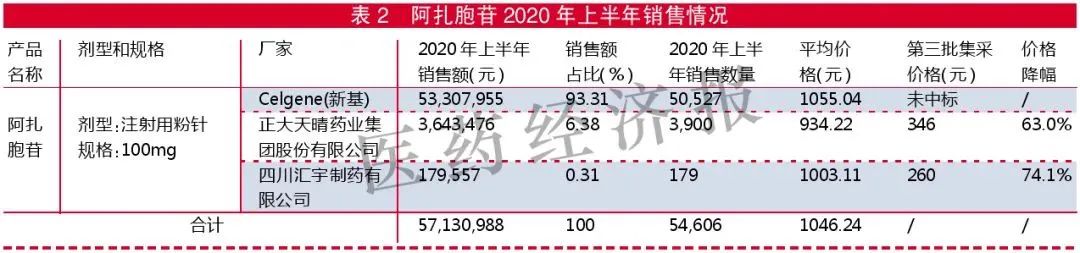 阿扎胞苷在样本医院销售的剂型和规格为100mg注射用粉针。2020年上半年,阿扎胞苷在样本医院的销售额为5713万元,新基、正大天晴和汇宇3家分别占93.31%、6.38%和0.31%。