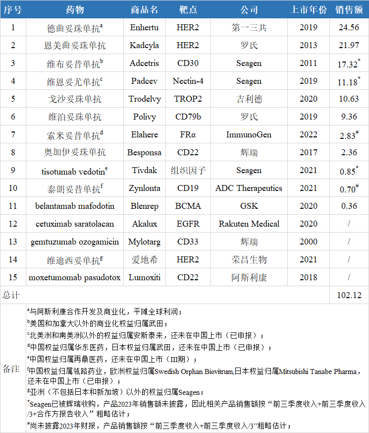 2023年,抗体偶联药物(ADC)赛道如火如荼,多款创新产品捷报频传、海内外授权交易层出不穷,上市药物的市场规模也首次突破百亿美元门槛,达到了102亿美元。