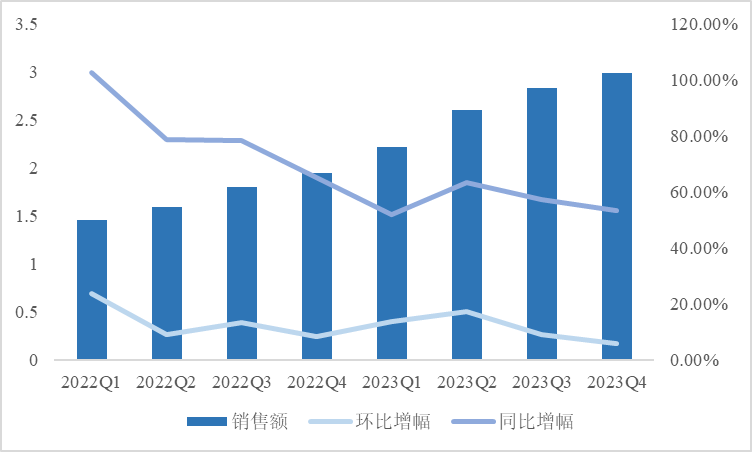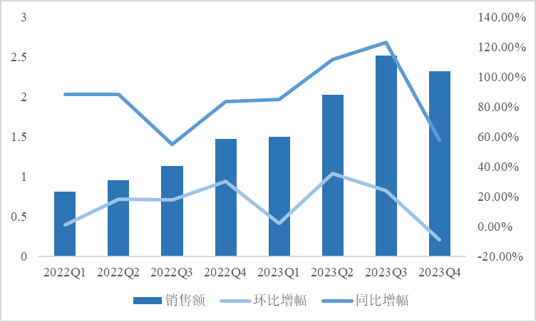 2022-2023年Trodelvy各季度销售额及增幅(单位:亿美元)