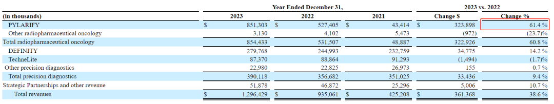 Lantheus核心产品是靶向PSMA的PET显像剂Pylarify,其收入占总营收65.67%(2023年收入8.51亿美元,同比2022年增长61.4%),是公司业绩增长的核心来源。