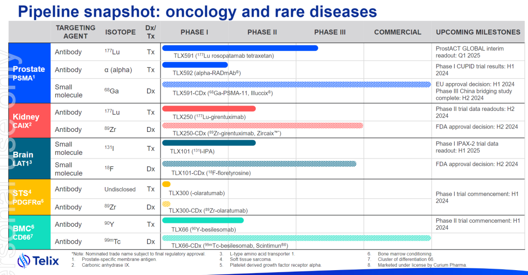 而除此之外,Telix不仅着眼于诊断性RDC产品,各个诊断性对应的疾病领域都布局了治疗性核药,最快的是治疗前列腺癌的RDC管线TLX591。