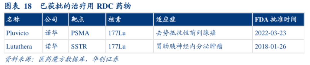 尽管全球批准了9款RDC药物,但其中7款均为诊断性产品,仅有诺华的Pluvicto和Lutathera为治疗性药物,可见RDC仍然处于早期快速成长阶段。