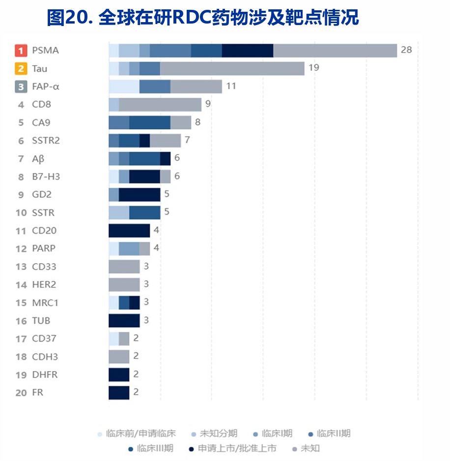 众所周知,由于实体瘤和血液瘤患者的悬殊数量对比,目前在研的RDC产品靶点还是集中在实体瘤领域,比如已经验证的PSMA,还有成纤维细胞活化蛋白α(乳腺癌、胰腺癌等)也是热门靶点。