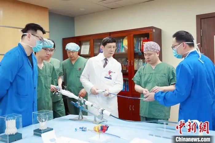 图为王建安(图中)教授团队和研发团队对经导管人工瓣膜系统进行功能探讨。浙江大学医学院附属第二医院供图