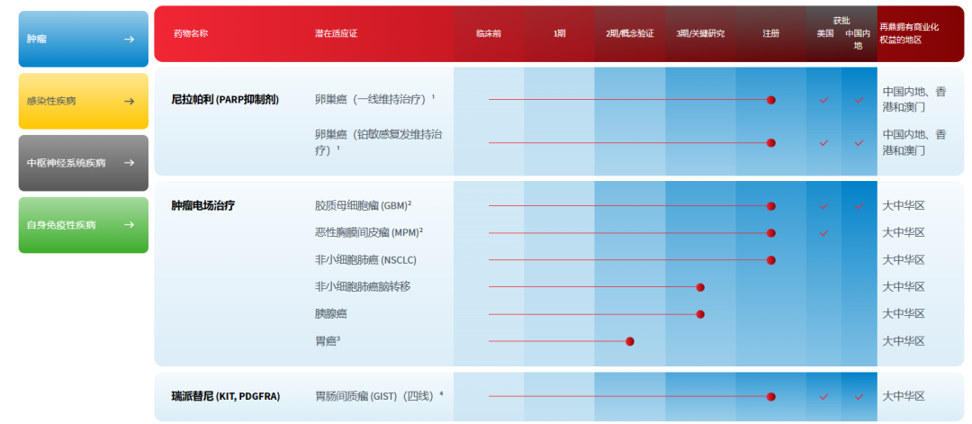 2023年,再鼎医药围绕多个关键战略重点取得出色进展。再鼎医药营收主要靠四款产品支撑,PARP抑制剂尼拉帕利(则乐)、肿瘤电场治疗(爱普盾)、治疗胃肠间质瘤的瑞派替尼(擎乐)、抗菌药甲苯磺酸奥马环素(纽再乐)。