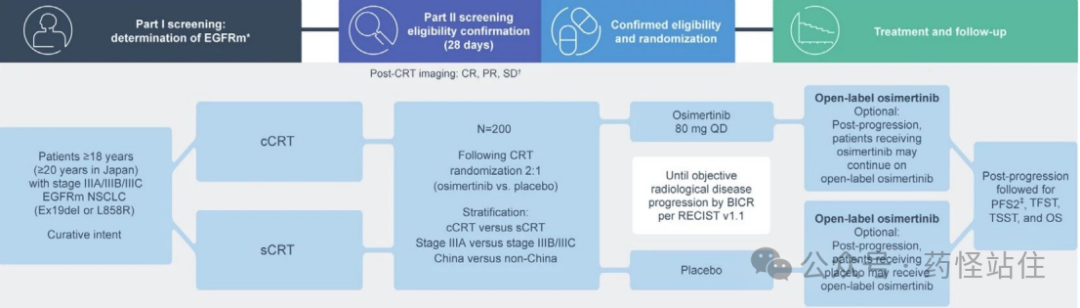 LAURA研究是一项随机化、双盲对照、多中心、全球的III期,探索相比安慰剂,奥希替尼用于不可切III期EGFR突变NSCLC 放化疗后维持治疗的疗效和安全性(相当于免疫版本的PACIFIC,AZ好擅长),主要终点为PFS。这次AZ更聪明了,不仅纳入了同步放化疗的人群,还纳入了RWS更多的序贯放化疗人群,并作为分层因素,PACIFIC学到的经验总是会指导未来临床试验设计,留给后面人的机会越来越少,同时LAURA研究并没有限制辅助治疗市场,从ADAURA中学到的经验,早期3年辅助并不够。2024年2月19日,公司公告达到主要终点,PFS实现获益,次要终点OS分析尚不成熟,但有获益趋势。