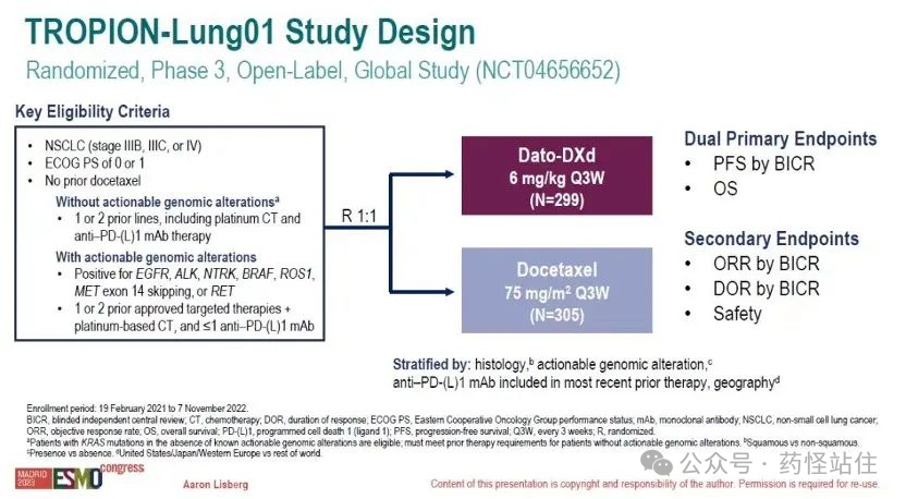 TROPION-Lung01是一项随机、全球多中心、开放标签Ⅲ期,探索相比多西他赛,Dato-Dxd用于既往至少接受过一次治疗、伴或不伴有AGA的局部晚期或转移性NSCLC的疗效和安全性,主要终点为BICR评估的PFS和OS,次要终点包括ORR、DoR和安全性。分层因素包括组织学、AGA、地域和既往PDX治疗。