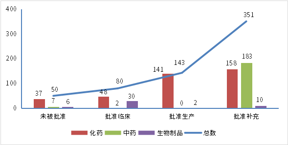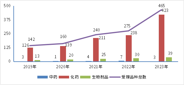 剔除补充申请(一致性评价受理号除外,下同)和进口数据后共计受理465个品种(受理号670个),其中中药3个品种数(受理号3个),化药423个品种数(受理号600个),生物制品39个品种数(受理号67个),总数较2022年增加190个品种。详见图1。