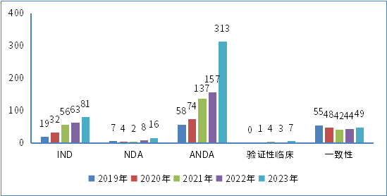 图2 2019-2023年四川省审评任务类型受理品种数(剔除补充、进口)
