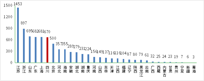 截至2023年12月31日,在国内各省市的药品申报方面(根据申报企业注册所在地统计,剔除补充申请和进口数据,一致性评价受理号除外),2023全年申报江苏以1453个受理号位居第一,其中,四川以670个受理号位居第6。详见图5。