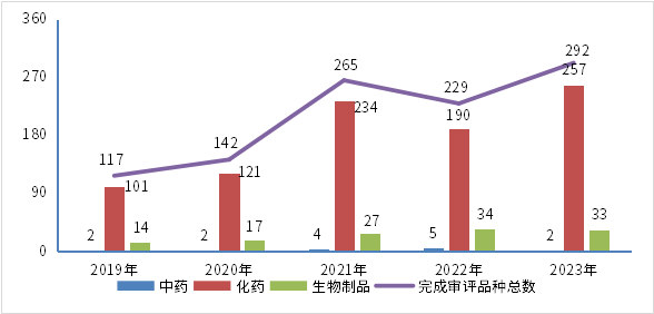 剔除补充申请(一致性评价受理号除外,下同)和进口数据后共计完成审评292个品种数(受理号413个),其中中药2个品种数(受理号2个),化药257个品种数(受理号359个),生物制品33个品种数(受理号52个),品种总数较2022年增加63个。详见图6。