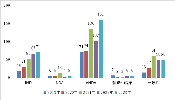 以注册申请类别统计(剔除补充、进口数据),2023年四川省完成审评的品种数中,按审评任务分类,IND完成审评71个品种(受理号114个),同比增加5.97%;NDA完成审评5个品种(受理号5个),同比增加25%;ANDA完成审评161个品种(受理号217个),同比增加56.31%;一致性评价完成审评50个品种(受理号70个)。详见图8。