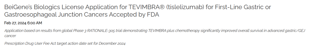 2月27日,百济神州宣布,美国食品和药物管理局(FDA)已经受理了替雷利珠单抗的生物制品许可申请(BLA),与含氟嘧啶和铂化疗联合治疗局部晚期不可切除或转移性胃或胃食管交界处(G/GEJ)腺癌患者。FDA预计将于2024 年12 月对该BLA作出决定。