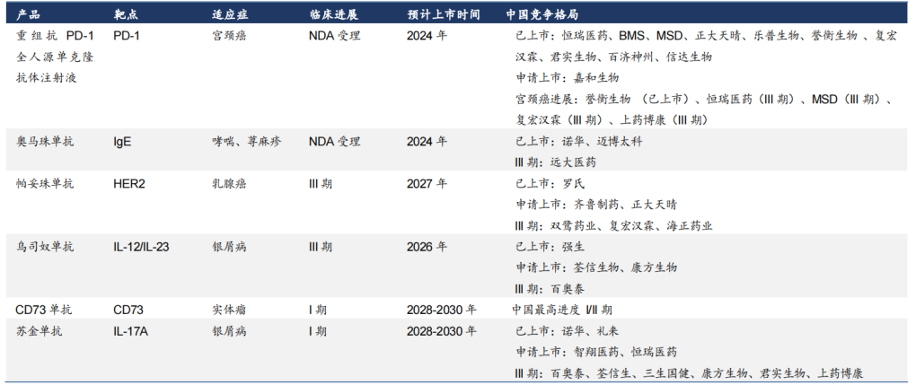 具体来看,PD-1恩朗苏拜单抗已经递交上市申请,有望于今年获批上市,首发适应症为宫颈癌,目前国内获批该适应症的厂家有誉衡生物。生物类似药中,奥马珠单抗已递交上市申请,预计2024年获批,有望斩获首款国产奥马珠单抗生物类似药;后续管线中还有乌司奴单抗类似药、帕妥珠单抗类似药,均已进入临床III期。