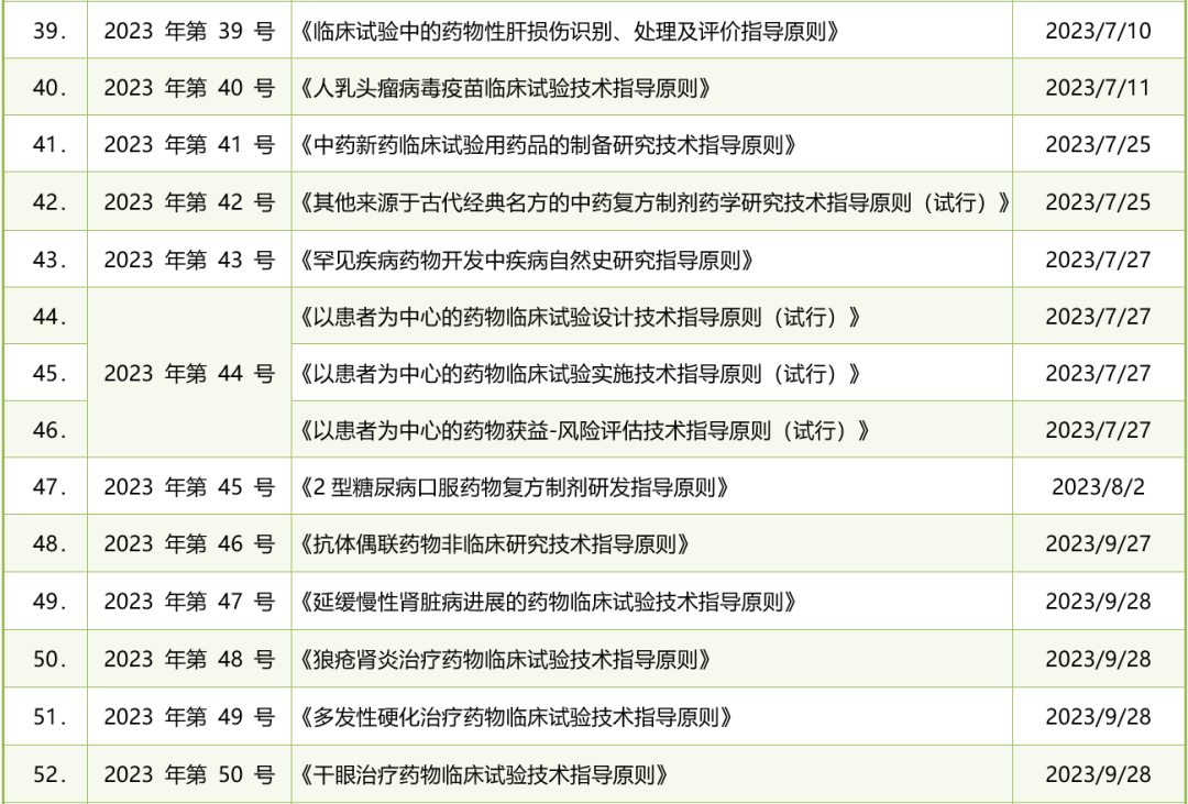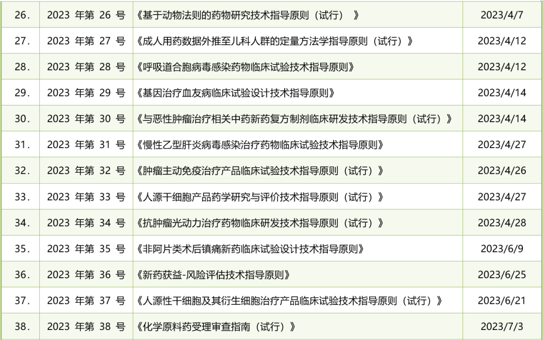 截至2023年12月31日,CDE累计共发布了66份与药品注册相关的法规政策文件。其中包括60个技术指导原则和其他6个指南,这些文件以61个技术指导原则通告文号的形式公布。平均每月CDE大约发布6份此类文件。以下是详细清单: