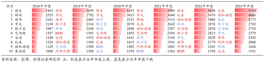 2018-2023 年药企全球市值TOP10变化(单位:亿美元)