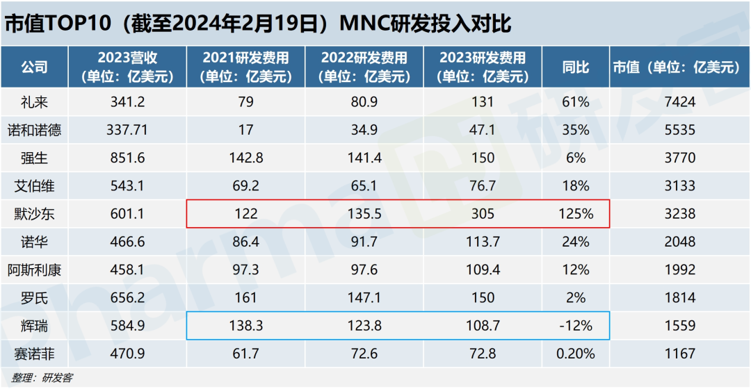 交完2023年成绩单之后,研发客留意到,市值前十的MNC中,大多数公司2023年的研发费用都比2022年有较大幅度的增长(见下图)。