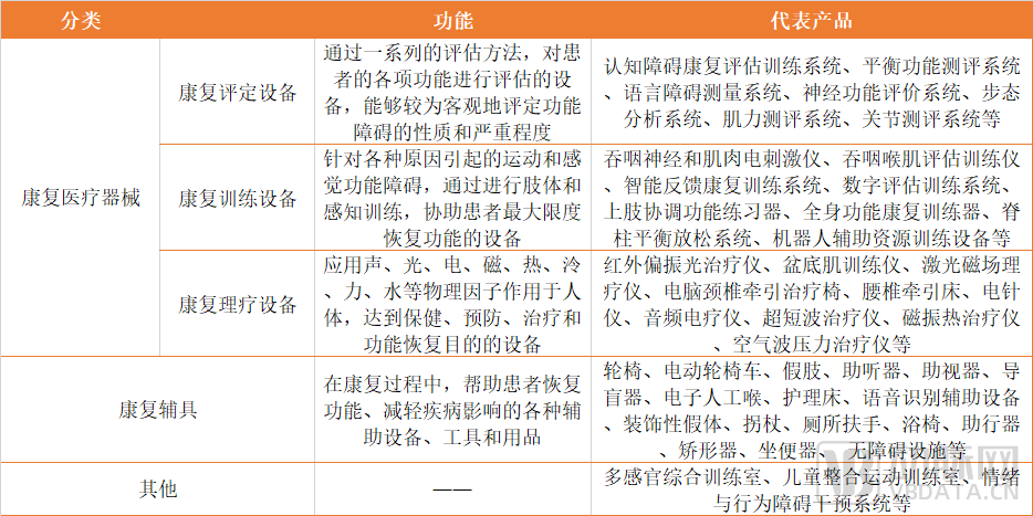 康复器械按照应用领域的不同,可分为康复医疗器械、康复教育设备和康复辅具等。其中康复医疗器械包括在康复医疗中用于康复评定、训练与治疗、有效改善或恢复患者功能的医疗设备,是康复器械的主要组成部分。