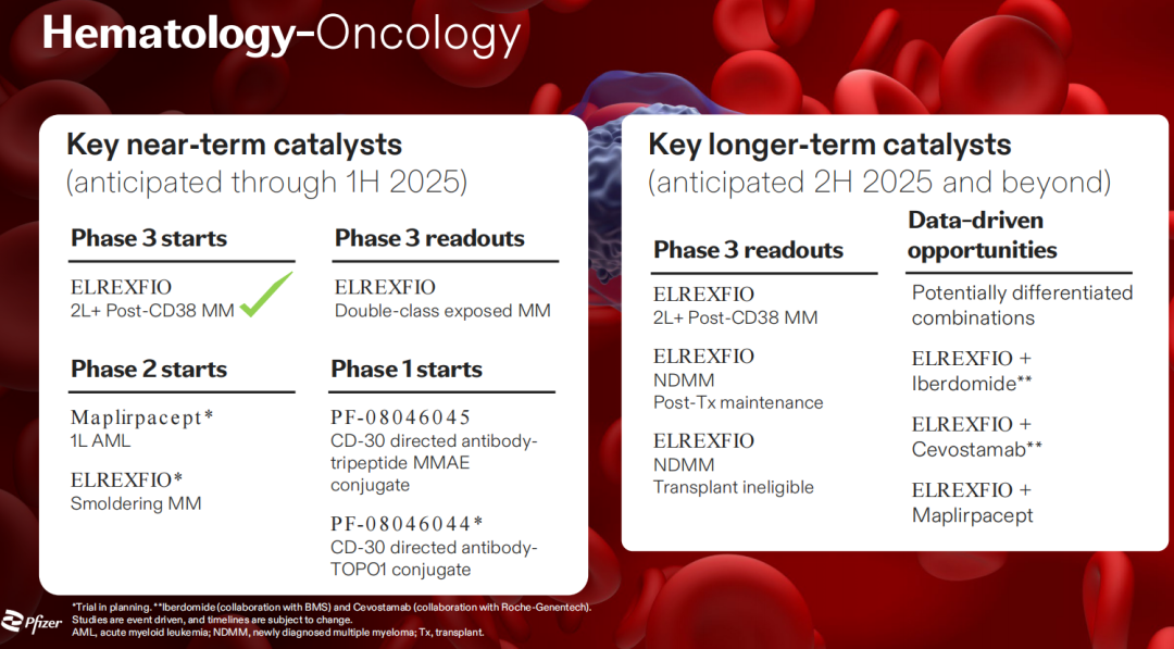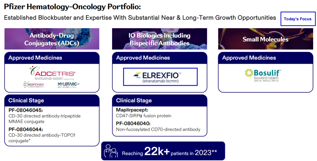 近期,辉瑞也开始向血癌领域进军,FDA批准了BCMA靶向双特异性药物Elrexfio。同样,多发性骨髓瘤治疗的多项3期试验正在进行中,包括2项针对新诊断患者的试验,作为移植后维持治疗或针对不适合移植的患者。此外,Seagen还有Adcetris,这是经典霍奇金淋巴瘤的知名重磅炸弹。