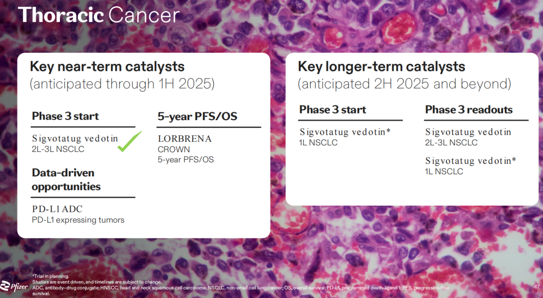 至于胸部癌症,辉瑞公司目前对此的布局相对较少。在肺癌方面,辉瑞正在努力将其第三代ALK抑制剂Lobrena作为该领域的新护理标准。整合素β-6定向ADC sigvotatug vedotin最近进入了预处理非鳞状非小细胞肺癌的3期试验,预计将在2026年或2027年左右获得读数。