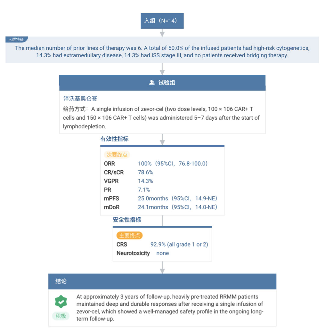 其中接受治疗的前 60 例患者中,中位随访时间为 12.1 个月,CR/sCR 率为 56.7%。中位 DOR 和中位 PFS 均尚未达到。在 9 个月的中位随访中,DOR 率为 86.1%,PFS 率为 84.6%。在达到 VGPR 及以上缓解的患者中评估了微小残留病(MRD),达到 CR/sCR 患者的 MRD(<10-5)阴性率为 100%,VGPR 及以上缓解的患者比率为 96.3%。