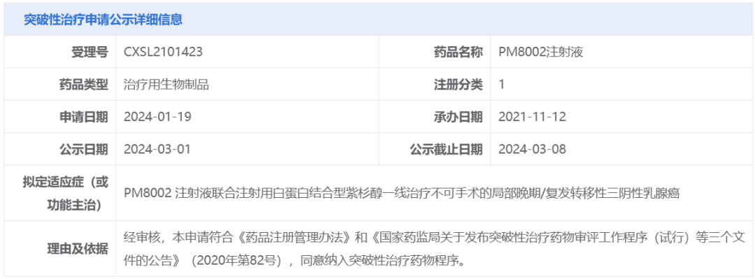 今日(3月1日),中国国家药监局药品审评中心(CDE)官网公示,普米斯生物申报的PM8002注射液拟纳入突破性治疗品种,针对适应症为联合注射用白蛋白结合型紫杉醇一线治疗不可手术的局部晚期/复发转移性三阴性乳腺癌。公开资料显示,PM8002是普米斯生物自主研发的抗PD-L1/VEGF双特异性抗体。BioNTech公司已与普米斯生物达成一项超10亿美元的合作,获得该产品在全球(大中华区除外)的开发、生产和商业化权利。