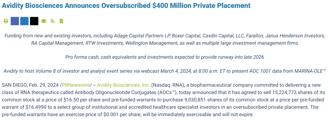 2024年2月29日,Avidity Biosciences宣布完成4亿美元私募融资,资金来自于现有投资者以及多家大型投资公司。