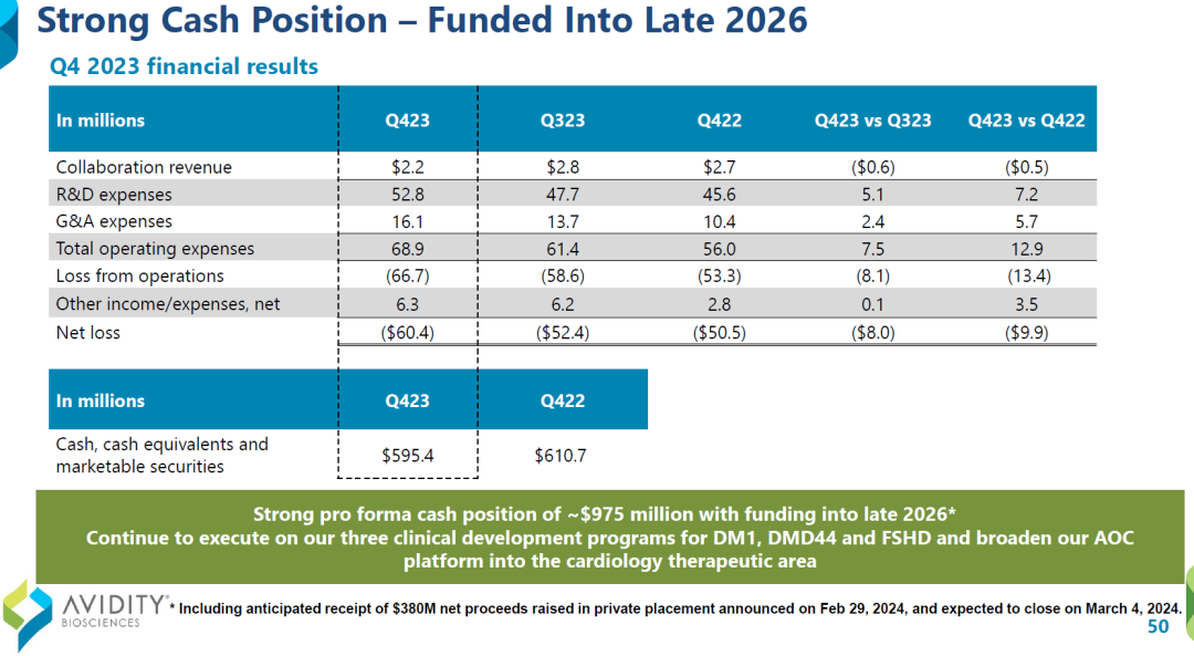 Avidity此前账上还有近6亿美元现金,加上此次4亿美元融资,现金储备将达到10亿美元,足以支撑运营到2026年底。