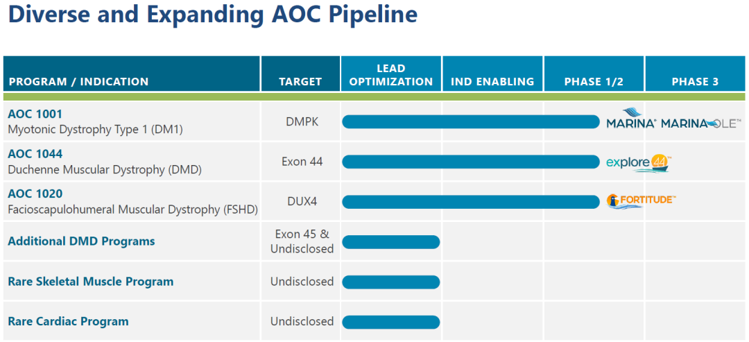 Avidity Biosciences的研发管线如下,3款产品处于1/2期临床阶段。