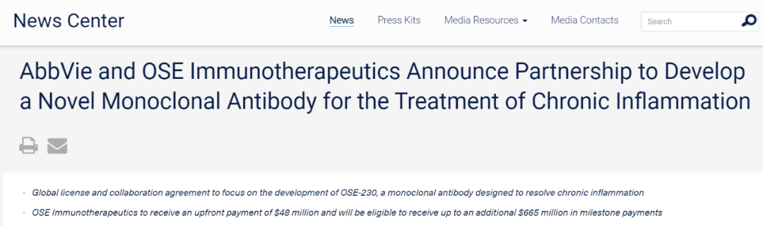 2月28日,艾伯维宣布,已与法国公司OSE Immunotherapeutics达成战略合作协议,引进一款严重慢性炎症性疾病在研新药OSE-230的开发、生产以及商业化全球独家许可权利。
