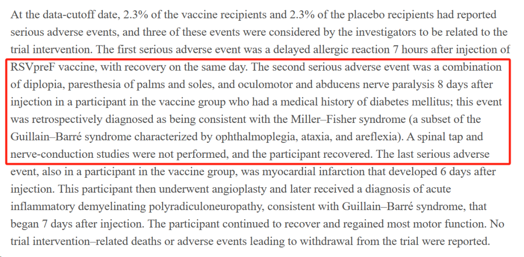 这里说的应该是辉瑞RSV疫苗的RENIOR试验,试验中有一名患者在疫苗注射后的第8天后出现了动眼神经和外展神经麻痹,被认为可能与试验有关。回顾性分析确认其发生Miller-Fisher综合征(GBS的一个亚型)。