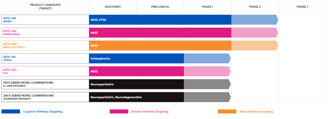 Alto Neuroscience创立于2019年,是一家处于临床阶段的生物医药公司,其使命是利用神经生物学原理开发个体化的高效治疗方案,重新定义精神病学。Alto公司的Precision Psychiatry Platform平台通过分析脑电图(EEG)活动、神经认知评估、可穿戴数据以及其他手段来测量大脑生物标志物,从而更好地确定哪些患者更有可能对其候选产品产生应答。Alto公司处于临床研发阶段的产品管线包括治疗抑郁症(MDD)、创伤后应激障碍(PTSD)、精神分裂症和其他精神疾病的新型候选药物,目前已有7款在研疗法进入临床开发阶段。