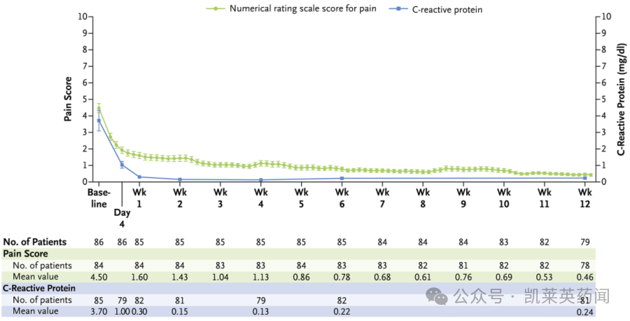 III 期RHAPSODY数据显示,接受rilonacept治疗的RP患者表现出临床改善的情况,患者最早在第一次给药后,疼痛和发炎的症状可以较为迅速持续地减少;此外,其治疗反应的中位时间为5 天,治疗反应率为97%,随机分配至Arcalyst的患者发生反复性心包炎事件的风险降低了96%。