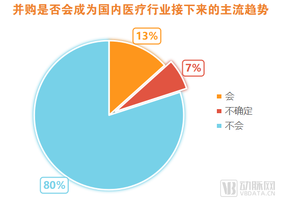 有意思的是,在参与动脉网问卷调研的15位医疗投资人中,绝大多数(12位)对接下来一段时间并购是否会成为医疗行业的主流持否定态度,他们普遍认为,国内医疗创新企业整体的差异化不大,很难与大企业形成互补。