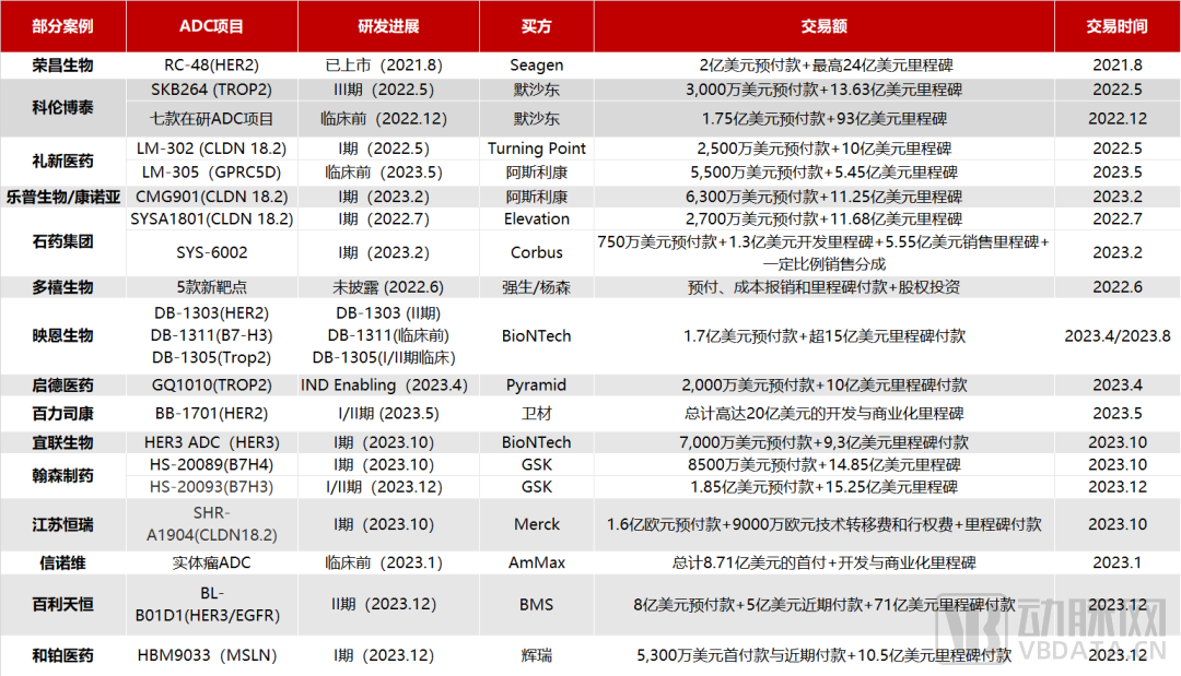再看ADC,其无疑是去年最为靓丽的风景线:2023年围绕ADC产生了多笔交易,更是有多家MNC与国内药企达成合作。比如百利天恒将EGFR×HER3 双抗ADC产品BL-B01D1的开发和商业化权益授予BMS,总交易金额高达84亿美元,其中首付款为8亿美元。