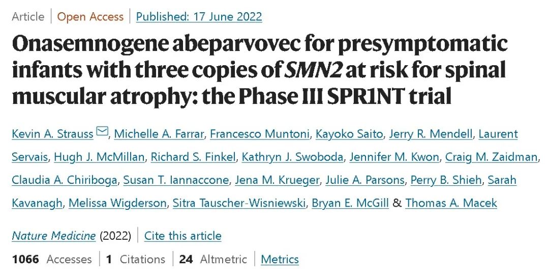 1.Strauss, K.A., Farrar, M.A., Muntoni, F. et al. Onasemnogene abeparvovec for presymptomatic infants with three copies of SMN2 at risk for spinal muscular atrophy: the Phase III SPR1NT trial. Nat Med (2022). https://doi.org/10.1038/s41591-022-01867-3