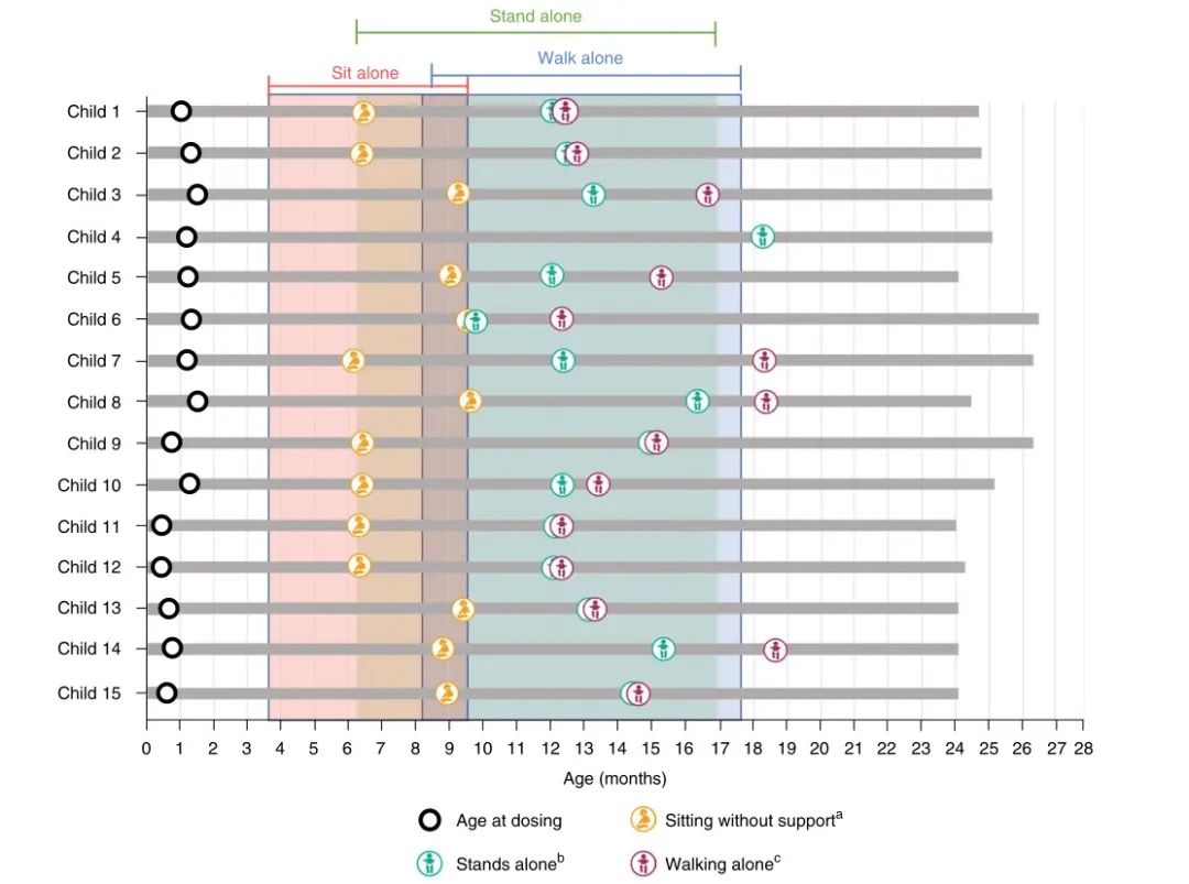 所有15名儿童在24个月大之前的就诊中,都做到了独立站立。在24个月的研究访问中,所有儿童都保持着独自站立的能力。有14名儿童在24个月内某一次就诊中至少独立行走了五步。相比之下,PNCR 81例SMA患者中只有19例做到了独自站立,17名可以独立行走。