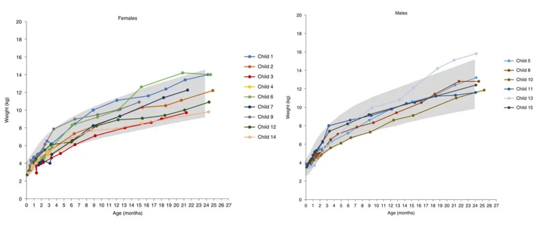 所有15名儿童在14个月大时均存活,在整个试验期间,没有儿童需要任何类型的机械呼吸支持(例如,咳嗽辅助、双水平气道正压或有创通气支持)。与此同时,15名儿童中有10名体重处于或高于世卫组织标准的前百分之三,并且在研究结束时,所有儿童都处于或高于该百分位。在研究期间都没有儿童需要喂食管来进行辅助喂食。