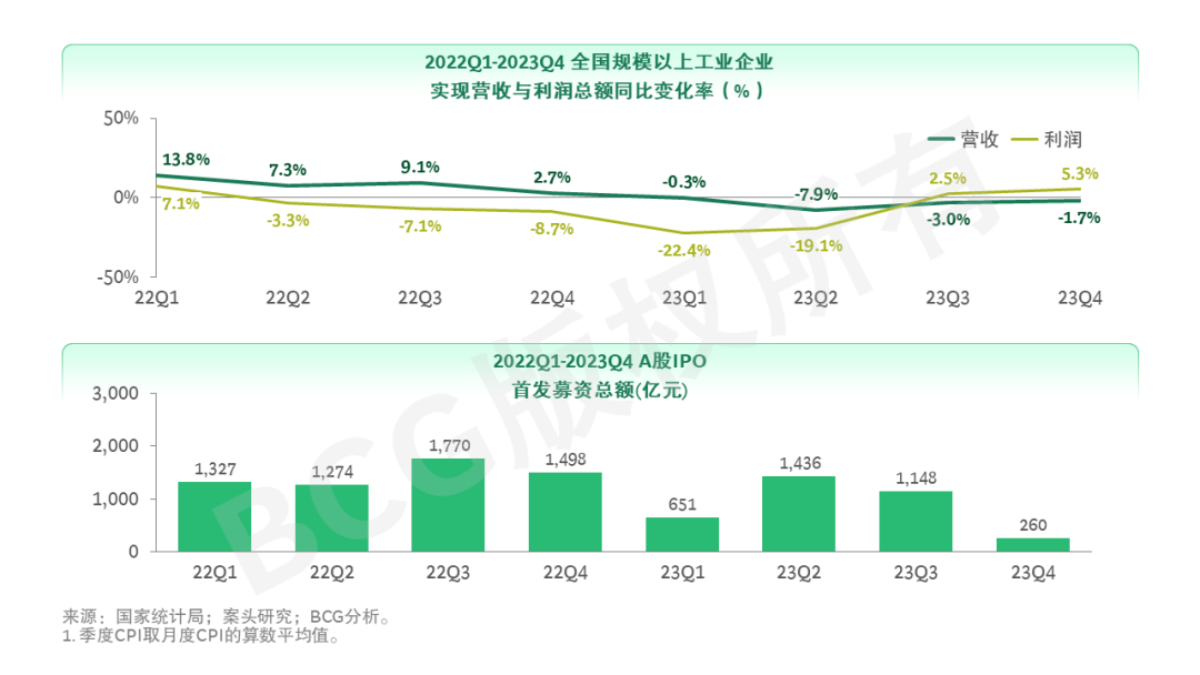 2023年以来,面临多重因素交织叠加带来的下行压力,中国经济复苏虽有所反复,但仍呈现回升向好趋势(参阅图1)。全年GDP同比增速5.2%,总体经济增长完成预期目标。从需求端来看,CPI持续低位运行,虽在12月CPI有所改善回升,但总体来看,消费需求仍有待进一步提振。从供给端来看,下半年规模以上工业企业利润由降转增、效益持续恢复,工业生产稳步回升。然而,资本市场仍显低迷,投资和退出均出现放缓,市场增量资金不足和经济预期低位使得市场对政策反应较为钝化。