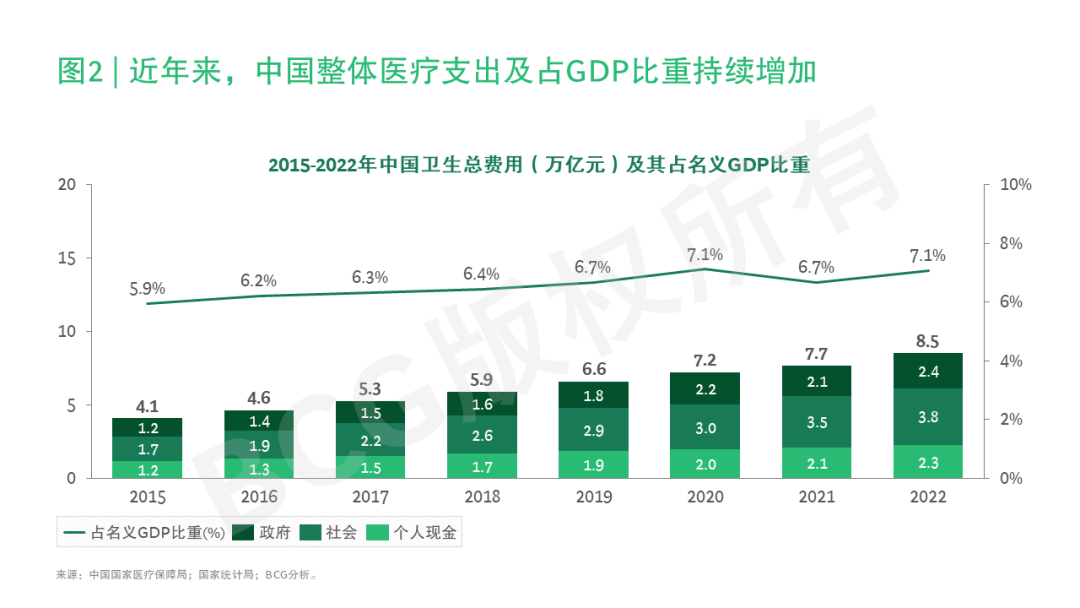 聚焦行业,医疗行业“保民生”和“高科技”的两大属性决定了其行业的长期基本面。从其民生属性来看,医疗保障是事关人民群众健康福祉的重大民生工程,近10年来,中国整体医疗支出持续增加,2022年全国卫生总费用达8.5万亿元,相当于2015年费用的两倍多,占GDP比重超过7%(参阅图2)。习近平主席在2024年新年贺词中也指出“老年人的就医养老”既是“家事”也是“国事”,再次强调了医疗卫生行业重大民生工程的地位。未来,在居民健康意识加强、老龄化加剧和政策支持的背景下,整体医疗保健支出预计将进一步增长。从医疗的科技属性来看,习近平主席在年初关于高质量发展的会议中强调“推进新型工业化和加快建设制造强国、质量强国等战略任务”,“科学布局科技创新、产业创新”。医疗作为高科技行业的重要组成部分,仍将是拉动新一轮经济增长的重要引擎。