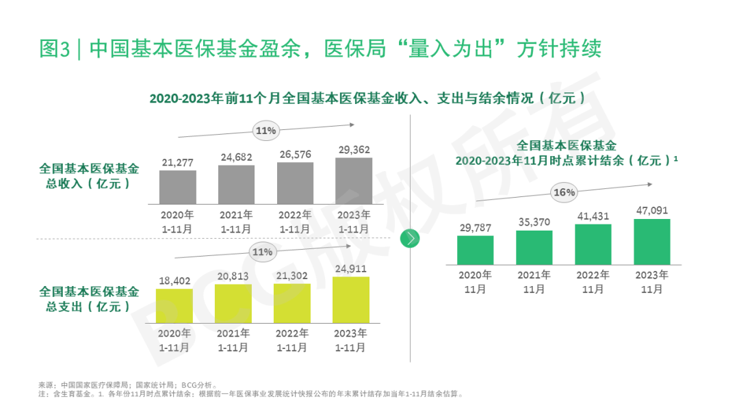 中国基本医保基金持续贯彻“量入为出”的大方针,基金运行整体保持稳健。2003年以来,中国基本医保基金收入均大于支出,当年收支和累计结余均保持稳定增长,截至2023年11月底,基本医保基金结余大于47,000亿元,远高于2023年1—11月支出约24,911亿元(参阅图3)。