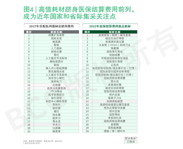在量入为出的大方针下,面临整体医疗体系仍需进一步推进覆盖和创新的要求,“腾笼换鸟”仍将是医保基金使用长期要求。2022年1月召开的中国国务院常务会议中决定常态化、制度化开展药品和高值医用耗材集中带量采购并提速扩面,通过带量采购发掘医保基金的节降空间以支持创新和覆盖推进。图4对比了2017年住院器材总使用费用靠前的耗材及中国国家医保局公布的2022年医保结算费用重点耗材列表。2017年住院器材总使用费用靠前的冠脉支架、骨科耗材、人工晶体均已经过国家带量采购;而2022年医保结算费用的重点耗材列表,相比2017年住院器材总使用费用靠前的产品已有较大差异,凸显带量采购对于耗材费用的影响。与此同时,2022年重点耗材列表中,位于前列的耗材多数已经过至少一次省级或省际联盟带量采购。