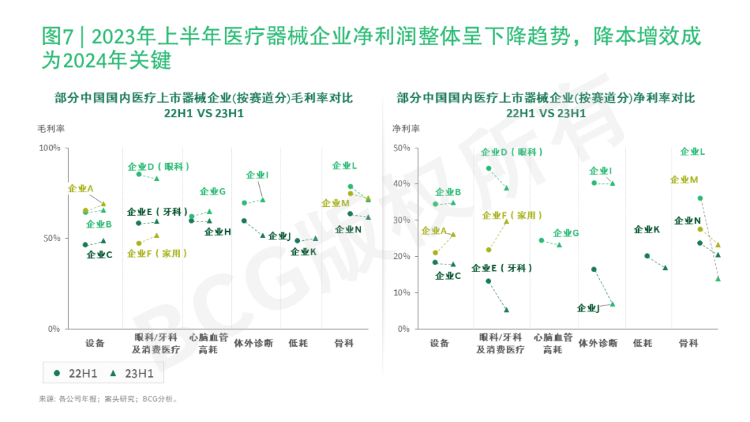 除营收之外,我们也注意到2023年上半年中国国内领先医疗器械企业的成本端承压。对于骨科等受集采影响较大的企业,净利率下滑更为明显。因此,在集采降价背景下,“降本增效”成为中国国内医疗器械企业2024年的必答之题和必由之路,相关企业应进一步加强成本管理能力(参阅图7)。