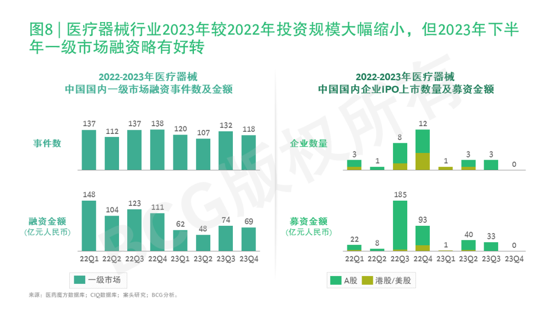 2023年,中国整体资本市场处于低位,一级市场和IPO上市情况低于往年同期。中国国内医疗器械领域投融资也不及2022年同期,一级市场投融资事件小幅下跌,但投融资额下滑明显,投早投小、估值谨慎趋势明显(参阅图8)。同时,医疗器械领域IPO上市企业数量较2022年明显下滑,整体IPO收紧也造成传统退出途径难度增大。