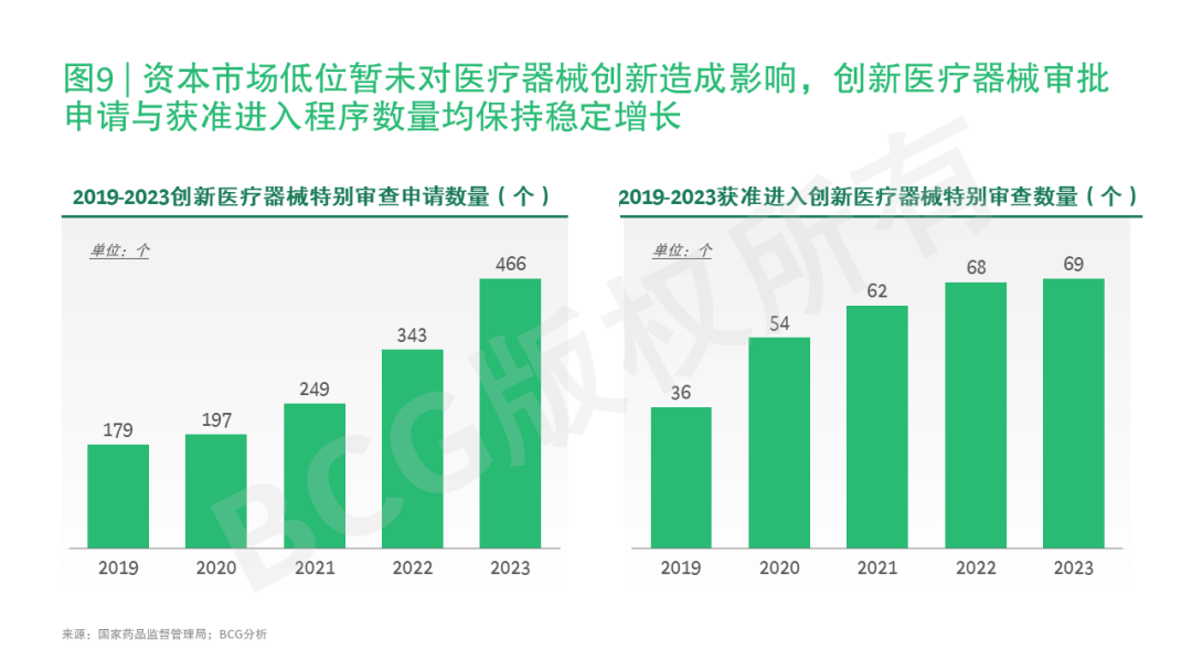 但长远来看,中国医疗器械行业仍有较大发展潜力,当前资本市场遇冷暂未对医疗器械创新造成影响,创新医疗器械特别审查程序申请及获准进入数量保持稳定增长。创新医疗器械特别审查获批数量增长略慢于申请增长,创新门槛不断提升,与BCG此前发布的《中国医疗器械创新之路》系列文章预测目前医疗器械向创新2.0及3.0转进的趋势吻合(参考图9)。部分医疗器械新兴赛道,如手术机器人、连续血糖监测等,尽管跨国企业存在先发优势,但本土企业快速跟进。从行业发展推手来看,投资和收并购将成为推动行业发展的重要手段。去年起,在估值合理化甚至部分保守的情况下,跨国药企开始大规模积极布局和拓展中国市场。虽然相较药企,目前跨国医疗器械公司在中国市场大规模、高单值的业务拓展和收并购事件还较少,但也有部分头部医疗器械公司通过建立合资公司、收购、战略合作等方式布局中国市场,例如GE医疗与国药器械成立合资公司、波士顿科学收购先瑞达部分股权、美敦力启动专注于中早期本土医疗科技创新企业的中国二期基金、强生成立中国创新中心孵化医药及医疗器械初创企业等。