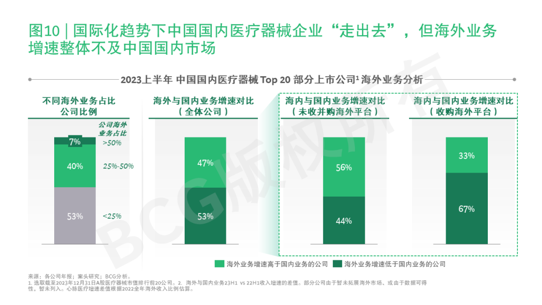 医疗器械企业在国际化领域开展较早,过去十余年间,迈瑞、威高、鱼跃、微创等领先医疗器械企业开展了一系列海外平台收并购,帮助公司快速拓展海外业务及产品线。然而,回顾2023年上半年中国国内市值前20医疗器械企业的业务营收,超过二分之一企业海外业务占比仍不足25%,不足10%的头部企业海外业务占比超过50%,对比海外医疗器械市场占比整体80%—90%的现状仍有较大提升空间。与此同时,50%以上的头部企业海外业务增速低于中国国内业务,在通过收并购海外平台进军国际化的企业中,约三分之二企业的海外业务增速不及国内业务增速(参阅图10),企业海外收并购后,在投后管理、实现协同等方面仍具有较大提升空间。