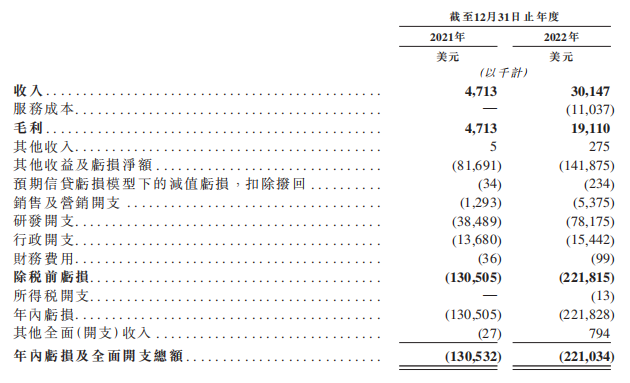 招股书显示,英矽智能2021年、2022年(药物研发服务、软件解决方案)营收分别为471万美元、3015万美元(约2亿元)(同比增长540%)。年内亏损分别为1.3亿美元、2.22亿美元(约15亿元),主要是因为研发开支达0.38亿美元、0.78亿美元(约5.6亿元)。