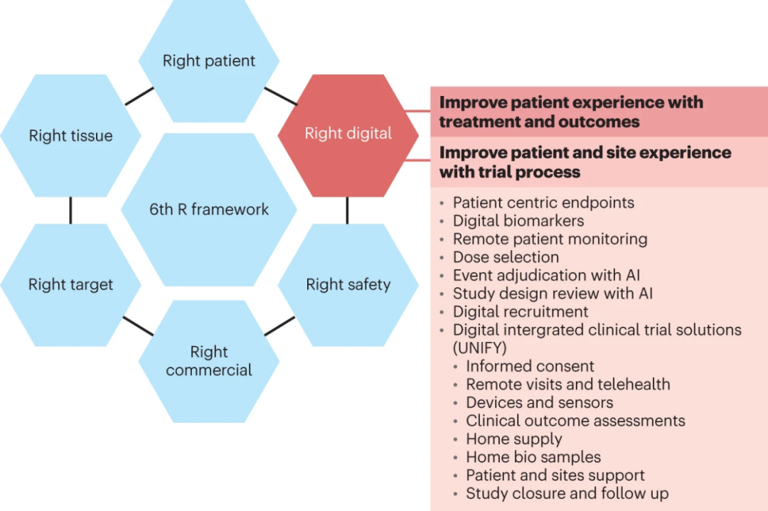 阿斯利康自创的“5R”原则将其研发成功率从4%提升至19%,领跑全球顶尖药企研发水平。2023年8月,现任阿斯利康全球研发首席数字健康官Cristina Duran博士正式提出将正确的数字解决方案(Right digital)加入“5R”,形成阿斯利康全新的“6R”研发原则[2]。(5R原则:指正确的靶点Right Target、正确的组织Right Tissue、正确的安全性Right Safety、正确的患者Right Patient、正确商业潜力Right Commercial)