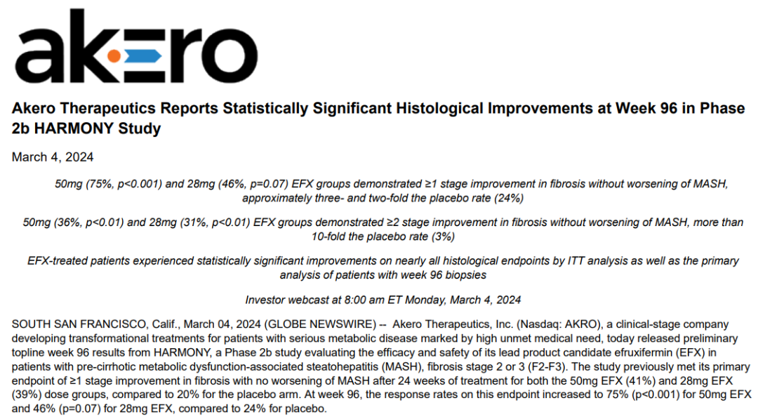 3月4日,Akero Therapeutics公布了HARMONY研究96周初步积极结果,该项IIb期研究评估了其主要候选产品efruxifermin (EFX) 对肝硬化前代谢功能障碍相关脂肪性肝炎(MASH,之前被称为NASH),纤维化2期或3期(F2-F3)患者的有效性和安全性。